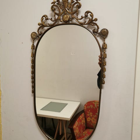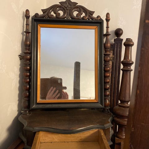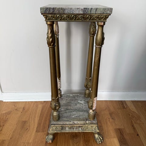 2 st väggmonterad hylla i svartmålat trä med dekorativ guldfärgad detalj framtill. Hyllan har profilerad kant och en svarvad konsol undertill. På baksidan finns två fästen för upphängning på vägg. Passar för mindre prydnadsföremål eller liknande.