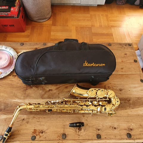 Thomann TAS-150 altsaxofon i mässing. Saxofonen har lackerad mässingskropp med graverad klocka. På bilderna syns medföljande tillbehör som rem, munstycksskydd, rörblad, putsduk och gigbag/väska från Thomann. Väskan går att ha som ryggsäck och har plats för tillbehören. Provspelad av saxofonist och mekaniken är i bra skick och alla klaffar är täta. Perfekt första instrument för nybörjaren!