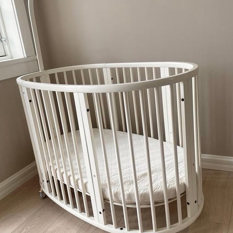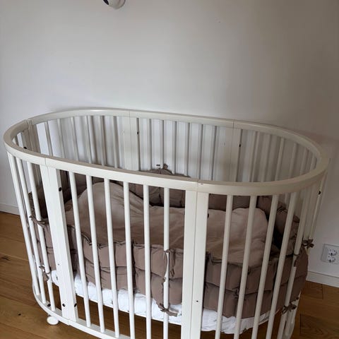 Stokke spjälsäng i vit färg. Spjälsängen har rundad form med ribbor runt om och står på hjul för enkel förflyttning. Den levereras med lösa gavel-/sidodelar som kan monteras efter behov. Passar som sovplats för spädbarn och småbarn i barnrum eller sovrum.