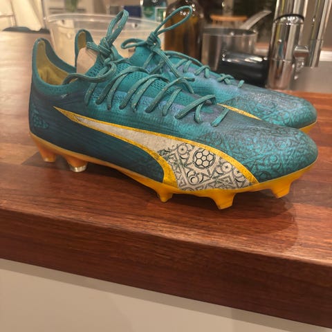 Puma Future 7 Ultimate Vol fotbollsskor i storlek EU 41 (UK 7,5, US 8,5, 26,5 cm). Skorna är avsedda för spel på både naturgräs och konstgräs (FG/AG). Ovandel i syntetmaterial med vit bas och mönstrade detaljer i blått och rosa. Yttersula med dobbar anpassade för bra grepp på planen. Snörning framtill för justerbar passform. Modellnamn: Puma Future 7 Ultimate Vol FG/AG, färg: White-Luminous Blue med rosa detaljer.