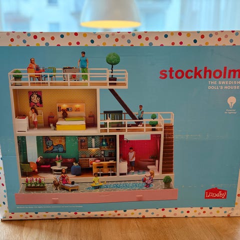 Lundby dockfamilj och egengjorda dockskåpsmöbler. Innehåller fem dockor (vuxna, barn och bebis) samt flera möbler och inredningsdetaljer i mindre skala. Möblerna består bland annat av fåtöljer, hyllor, byråer, mindre förvaringskorgar och andra tillbehör i olika färger. Passar till Lundby dockskåp eller andra dockhus i liknande skala för lek och inredning.