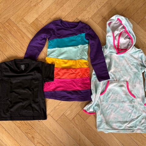 2 joggingbyxor, 4 t-shirts, 1 tröja, 3 jeans. Två av jeansen har en reva vid knäet, se foto. Stl 110 och 116.