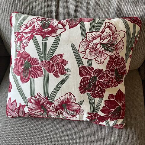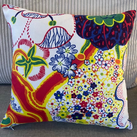 Prydnadskudde i tyg Brazil från Svenskt Tenn. Lekfull form och livfullt mönster som lyfter vilken soffa eller fåtölj som helst. En unik detalj för ett personligt hem.
