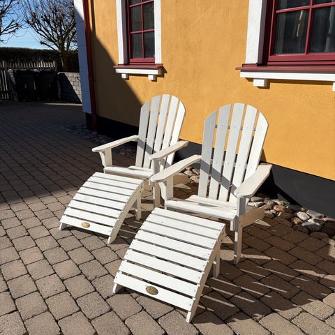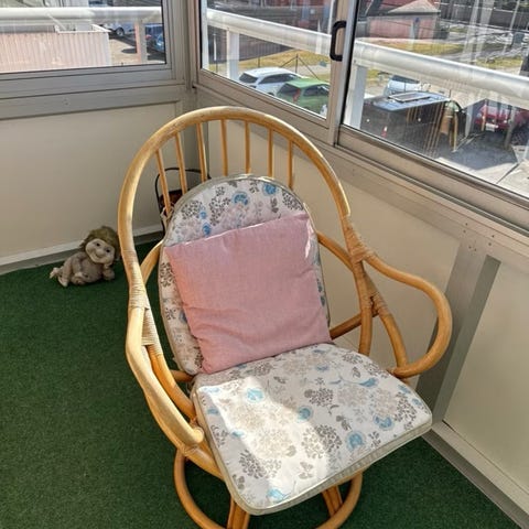 Har stått inomhus i alla år, sittkudden har blivit solblekt på ena sidan men annars är stolen i nyskick.