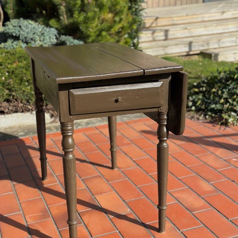 Säljer ett fint och stabilt antikt klaffbord med två matchande stolar. Bordet har en rustik träskiva och gröna ben/stolar i linoljefärgen 60% Grönjord från Gysinge.