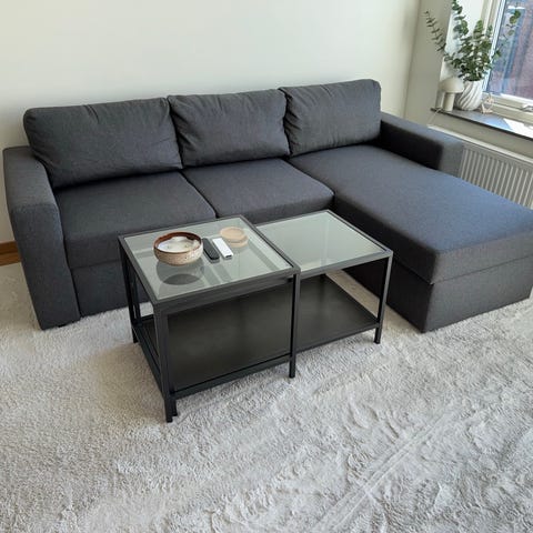 Bäddsoffa ca 4 år gamla köpt på Jysk, inget synligt slitage finns, bäddas enkelt genom att fälla ner ryggstödet. Måtten är Sovyta 108x180 cm. B180 x H82 x D92 cm