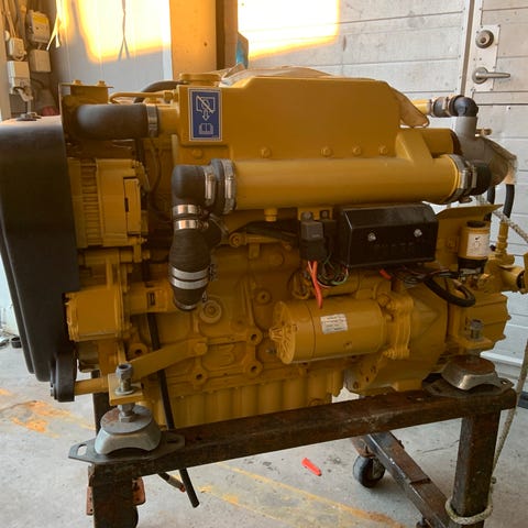 båtmotor i grön färg. Motorn är avsedd för fast installation i båt som inombordare. Flera anslutningar, slangar och komponenter ingår. Den är komplett med turbo samt alla värmeväxlare. Motorn är placerad på lastpall och spänd med spännband, vilket underlättar transport och hantering. Passar som ersättningsmotor eller för den som behöver en komplett inombordare för ombyggnation eller reservdelar.