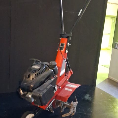 Bensindriven jordfräs med en motor på 123 cc, arbetsbredd på 36 cm, arbetsdjup på 12 cm, fyra metallrotorer och ett framhjul.