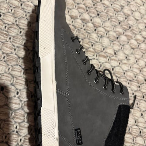 Skorna har en robust sula och vita sömmar som detalj.