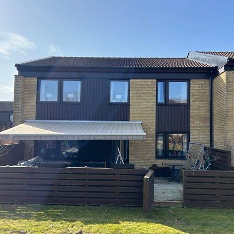 Markis terrassmarkis i rödbrun textil med vit ställning. Markisen är avsedd för montering på husfasad och ger sol- och insynsskydd över altan eller uteplats. Passar för fastighet med träfasad liknande den på bilderna. Markisen är utfällbar med armar som ger ett täckt område framför väggen. Lämplig för användning under vår-, sommar- och höstsäsong som skydd mot direkt solljus. (nypris 25000kr) OBS! Nedmonteras av köparen