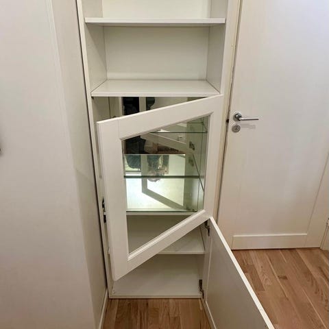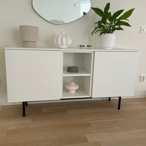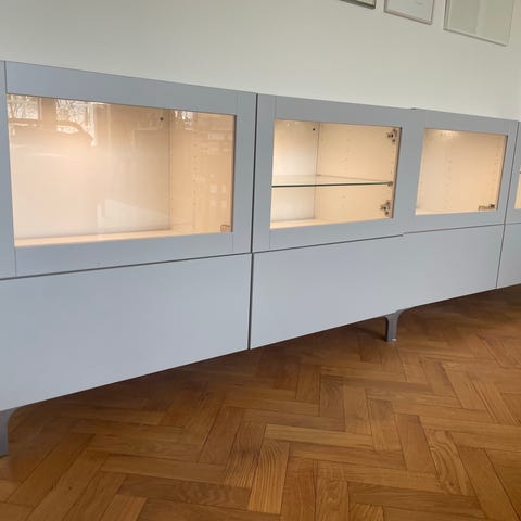 Skåp + dörrar + gångjärn från modellen Bestå från IKEA som innehåller ett hyllplan per sida. Mått 120x20x64cm.