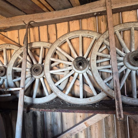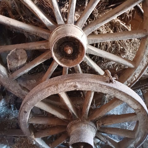 Vagnshjul i trä med metallring. Hjulet har ekrar i trä och en navdel i metall. Passar som reservdel till äldre vagn eller som dekorativt inslag i trädgård eller inredning.