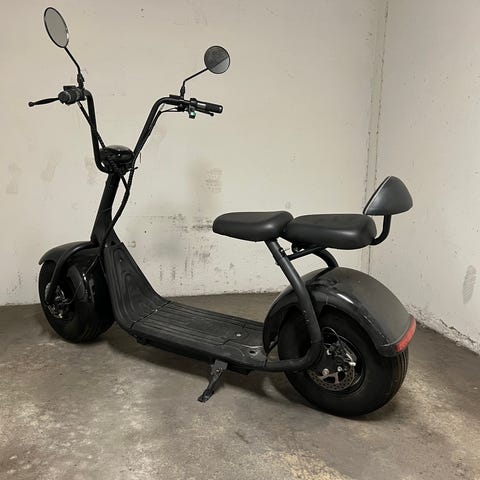 Elscooter (fatbike) med breda däck och dubbelsäte. Finns 2 lägen (25km/h-45km/h), okej skick. Nån liten skada på skärmen bak. I övrigt funktionsduglig