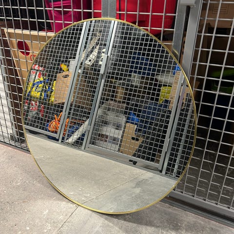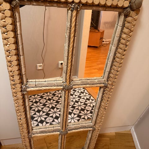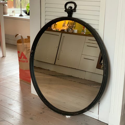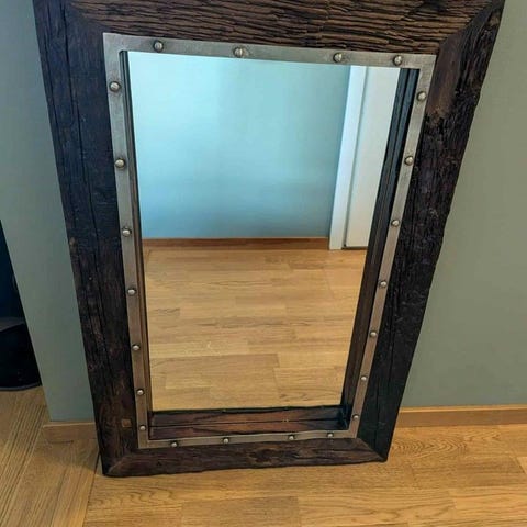 Spegel i rustik stil aldrig använd. En liten del har lossnat men kan enkelt fixas. Original pris 2000kr
