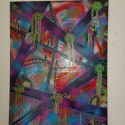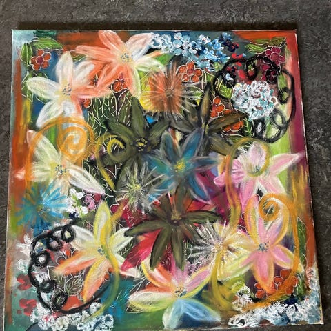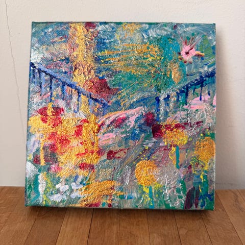 Tavla med akrylmålning som föreställer ett naturmotiv med vattenfall, växtlighet och blommor kombinerat med ett kvinnoporträtt. Färgstark komposition med inslag av grönt, blått, lila, rosa och gult. Passar som väggdekoration i exempelvis vardagsrum, sovrum eller arbetsrum. Målad på pannå.Storlek 40x30 cm.