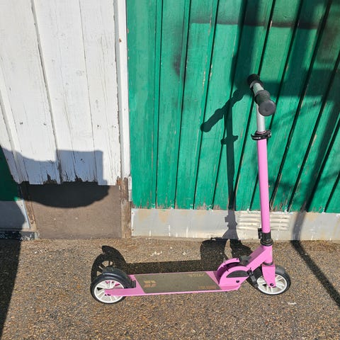 Micro sparkcykel trehjuling i rosa färg med tre hjul för extra stabilitet. Styre med svarta handtag och låg ståplatta anpassad för mindre barn. Passar för kortare turer på gångvägar och plana underlag.