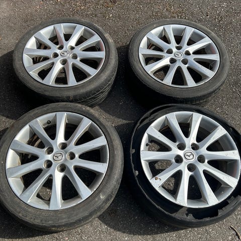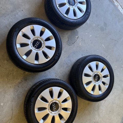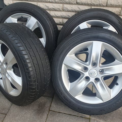 Fälgar i lättmetall i silverfärg. Femekrade fälgar som passar personbil. Levereras som uppsättning om fyra hjul med monterade däck enligt bild. Exakta mått, bultmönster och dimensioner framgår inte och behöver kontrolleras mot aktuell bilmodell innan användning.