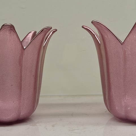 två vackra ljushållare i frostat glas, ca 10 höga och ca 13 i dia. Säljs utan ljus. Skickar inte men kan mötas utefter gröna linjen från Abrahamsberg - Medborgarplatsen