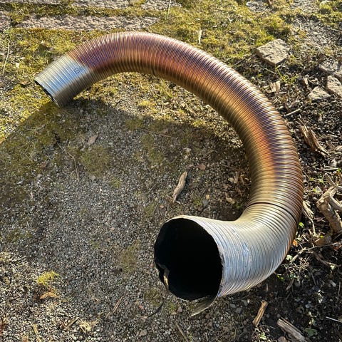 Ventilationsrör och kanaldelar i plåt. Blandade raka rör, böjar, T-rör och kopplingar för ventilationssystem. Lämpliga för installation eller komplettering av ventilationskanaler i exempelvis garage, förråd eller bostad där plåtkanaler används. Stått utomhus, men ingen synlig skada.