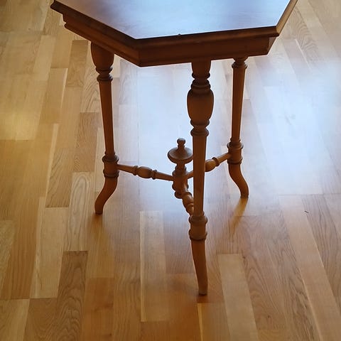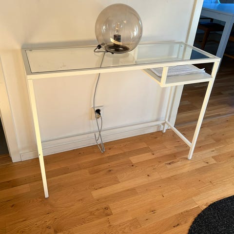 Säljer hallbord, det finns hiss i huset. På slide 3 finns det ett litet märke på bordet.