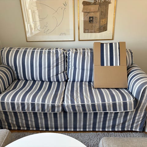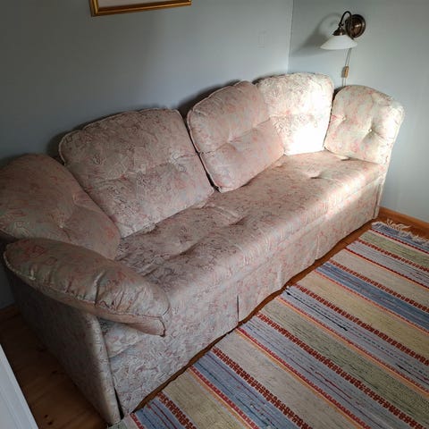 Liten och nätt bäddsoffa. Obetydligt använd. Nypris: 3995:- Förvaringsutrymme för sängkläder i soffan. Soffan har tre lösa ryggkuddar och raka armstödsfria sidor. Passar som sitt- och sovmöbel i vardagsrum, gästrum eller mindre utrymmen.