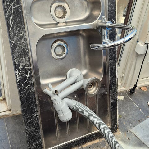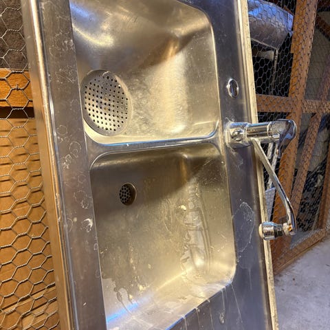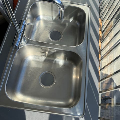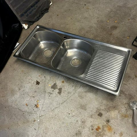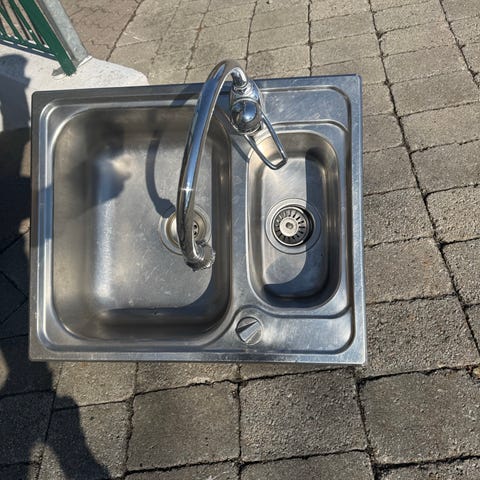 Diskho i rostfritt stål med dubbel ho och avrinningsdel. Mått diskho: 54x54 cm, fabrikat Intra.