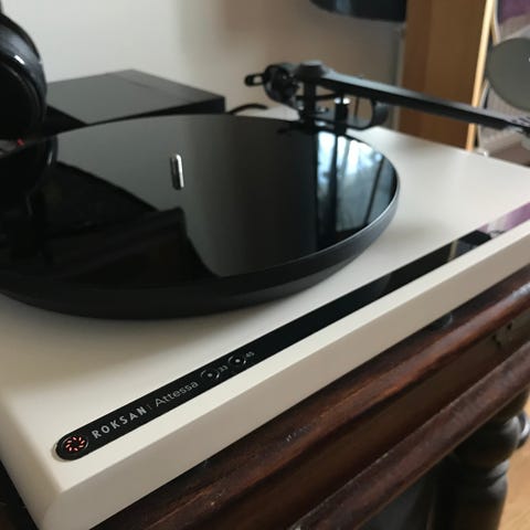 En manuell remdriven skivspelare med en tung skivtallrik av transparent akryl.