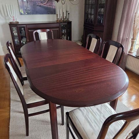 Matgrupp med vitrinskåp bord och 6 stolar ljusgtön trä