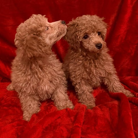 Han valpen är den enda unika i kullen som fick pappas toy genetik, född 102 gr. och kommer att väga som vuxen c.a 3 kg. Honan är den största i kullen, född 153 gr. och kommer att väga mellan 5-5,5 kilo. Båda valpar väger under handbagage nivå och kan resa/ flyga med de. Båda fick pudel hypoallergiska päls och lung temperament, som är fin balanserad med mammas livliga humör, väldigt nyfiken och socialt karaktärsdrag.