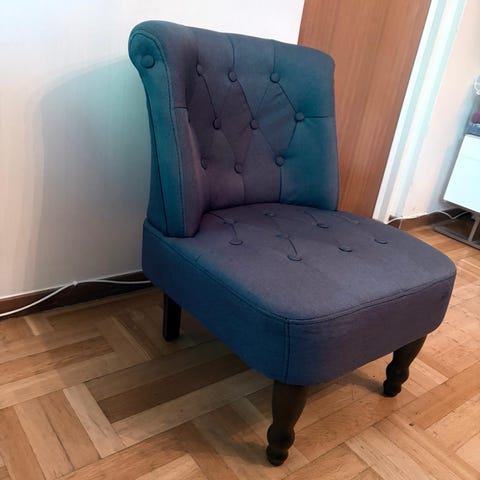 Säljer en fåtölj i en djup blå nyans som verkligen lyfter rummet! Den har en rund, mjuk form och klädd i ett bouclé-tyg som både känns lyxigt och är bekvämt att sitta i.