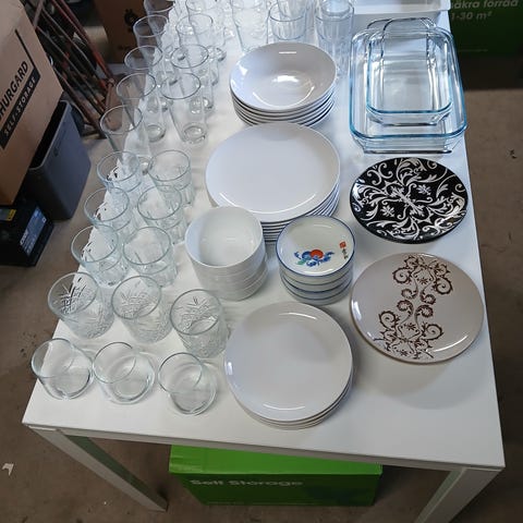 porslin och glas köksutrustning i blandat set. På bilderna syns olika typer av serveringsfat, skålar, glas och vaser i huvudsakligt klarglas och vitt porslin. Setet innehåller bland annat dricksglas, vinglas, skålar i glas och porslin samt några dekorativa delar för servering. Passar för dukning, servering och förvaring i kök och matsal.