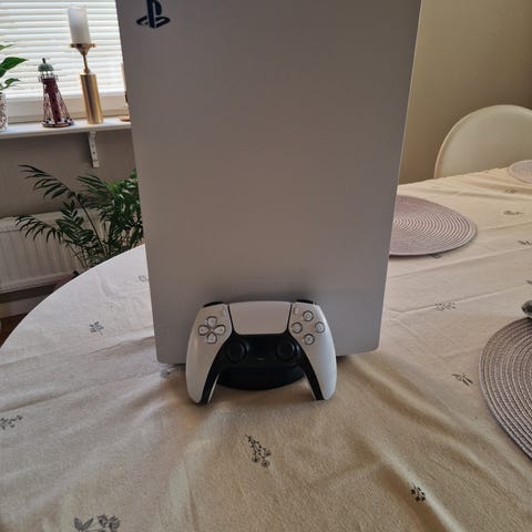 Sony Playstation 5 spelkonsol i vit färg. Konsolen är avsedd för hemmabruk och ansluts till TV eller bildskärm via HDMI. Stöd för trådlösa handkontroller och nätverksanslutning för nedladdning av spel och onlinespel. Passar för användning med kompatibla Playstation 5-spel och digitalt innehåll via Playstation Network. På grund av handskada spelat i 15 minuter. Nyskick, ingen låda.
