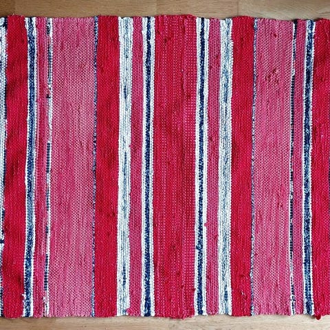 Trasmatta vävd i kypert, i rött, rosa och vitt med lite inslag av andra färger. Ej använd.