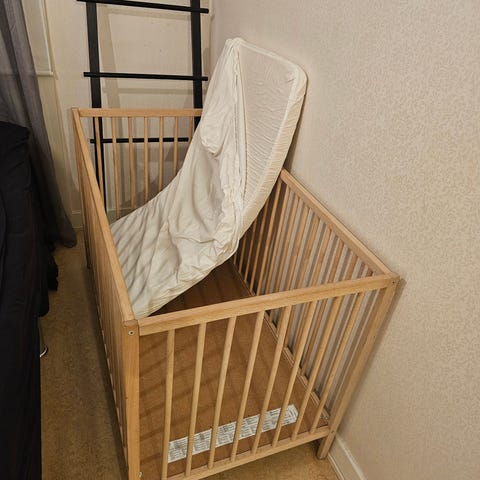 IKEA spjälsäng (sniglar) i ljust trä i naturfärg. Välanvänd men i gott skick och inga större slitage. Det sitter 2 skruvar i ramen där kamera varit installerad så om dessa tas bort blir det såklart 2 små hål där. (Se bild 2)