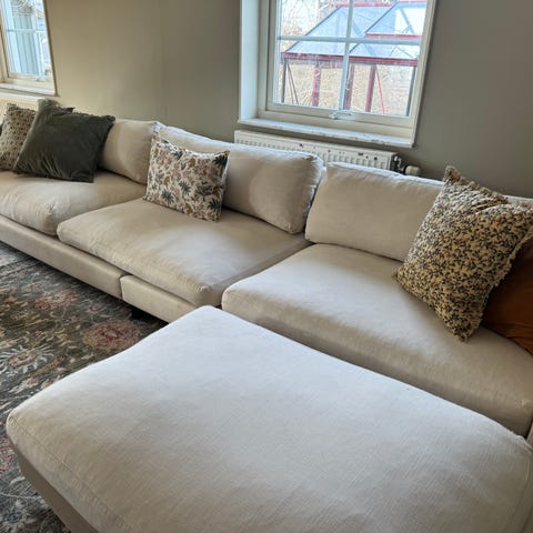 Stor divansoffa med ekbricka inköpt på folkhemmet 2023 för 28.000 kr, kvittofinns. Säljes p.g.a. flytt till mindre lägenhet.
