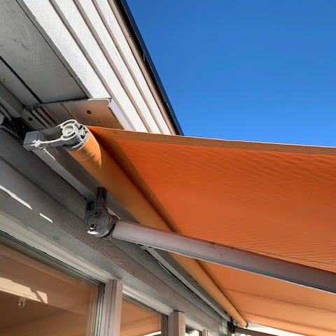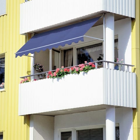 Markis motordriven för balkong eller terrass i beige textil. Monterad ovanför balkongräcke och fästs i vägg. Ger skugga och insynsskydd på uteplats. Passar för användning på lägenhetsbalkong eller liknande utomhusmiljöer.