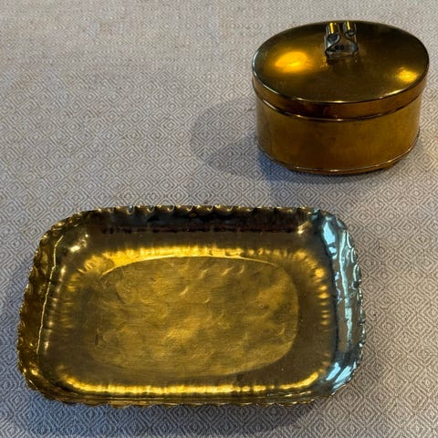 Mönstrat cigaretteetui i metall med slät baksida, mått ca 8,5 x2 cm. Askkopp mått ca 18x4 cm. Säljs tillsammans för 200 kr.
