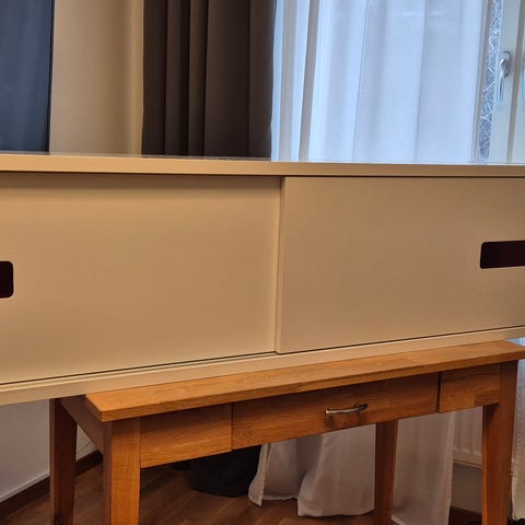 Mediabänk i svart trä med skjutdörr i metall, nypris ca 4000
