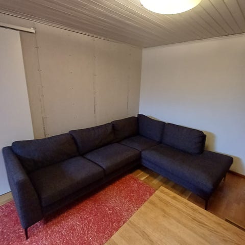 Soffan är i gott bruksskick. Det finns någon enstaka liten fläck som knappt syns, men då hela klädseln (även på stommen) är helt avtagbar går den utmärkt att tvätta i maskin så att soffan blir som ny igen!