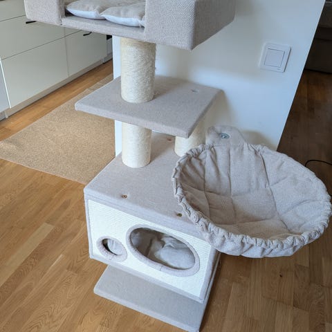 Katträd klösträd med flera nivåer och liggplatser. Utrustat med flera plattformar i olika höjd, klöspelare i repmaterial samt en större korg/koja längst ned. Passar för inomhusbruk för en eller flera katter som vill klättra, vila och klösa.