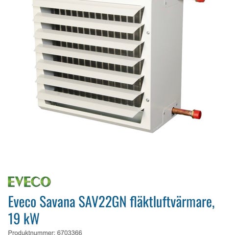 SWS stationär fläktluftvärmare med vattenburen värme. Enheten är avsedd för fast montage på vägg eller i tak och ansluts till ett vattenburet värmesystem via kopparrör. Luftvärmaren har horisontella lameller för riktning av luftflödet och är lämplig för uppvärmning av exempelvis garage, verkstad eller lagerlokaler. Höljet är i metall och enheten är avsedd för inomhusbruk i torra utrymmen.
