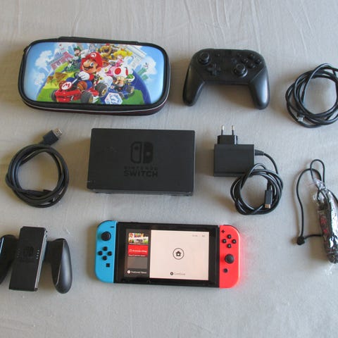 Nintendo Switch spelkonsol i grå färg. Bärbar och stationär konsol går enkelt att koppla till tv eller spela som den vissas på bilden spelet mario kart 8 medföljer
