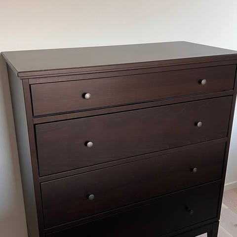 Byrå i svart trä med handtag i naturläder, nypris ca 7500kr