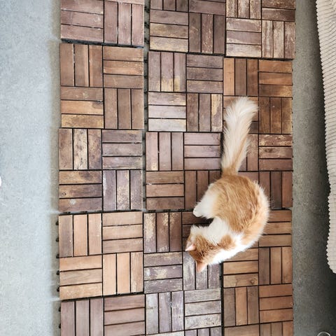 Trallgolv i trä för balkong eller uteplats. Består av kvadratiska trallplattor som läggs samman till ett heltäckande golv. Passar för användning utomhus på balkong, altan eller annan plan yta. Färgen är naturligt trä med varierande nyanser. Materialet är trä.