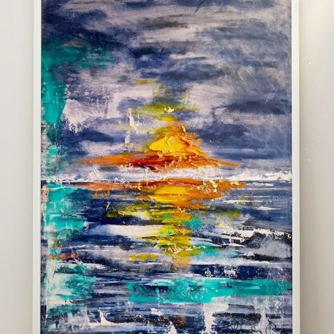 Abstrakt handmålad tavla i harmoniska blå, turkosa och jordnära toner med inslag av vitt och guld. Ger ett lugnt men samtidigt dynamiskt uttryck och passar perfekt i vardagsrum, sovrum eller kontor.