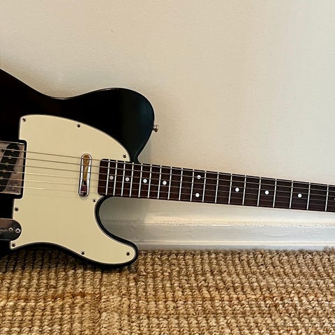 Övningsförstärkare, kabel och ett gäng plektrum ingår i priset.