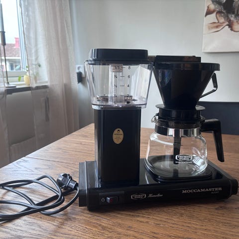 Moccamaster kaffebryggare med glaskanna i svart utförande. Passar för bryggning av filterkaffe. Glaskannan har handtag och lock i plast, men locket är skadat så det inte sitter fast i kannan (se andra bilden); påverkar funktion vid hällning. Ny kanna kan köpas i butik som reservdel.