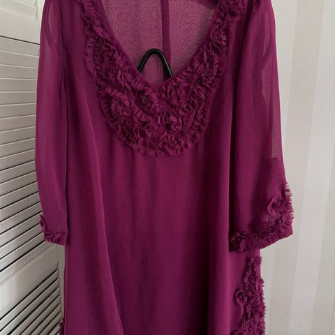 Italiensk party-/cocktailklänning för dam i storlek L. Klänningen är vinröd, tvådelad och tillverkad i viskos. Modellen har flera lager i kjolen och överdelen har kort ärm med lös passform upptill. Passar för fest- och cocktail tillfällen.