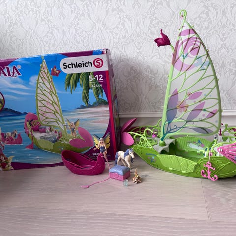 Playmobil lekset med två fe-figurer, två lila båtar och tillbehör. Figurerna är utklädda till feer med vingar och tillhörande stav och trollspö. Båtarna är lila med guldfärgade detaljer och åror. I setet ingår även två delfinfigurer i vitt. Passar för lek med fantasivärld, vattenmiljöer och rolllek med figurer och fordon.
