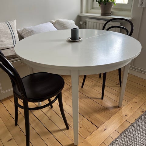 Runt bord med iläggsskiva och 4 stolar. Nymålade. 105x105cm. Finns i Johanneberg.
